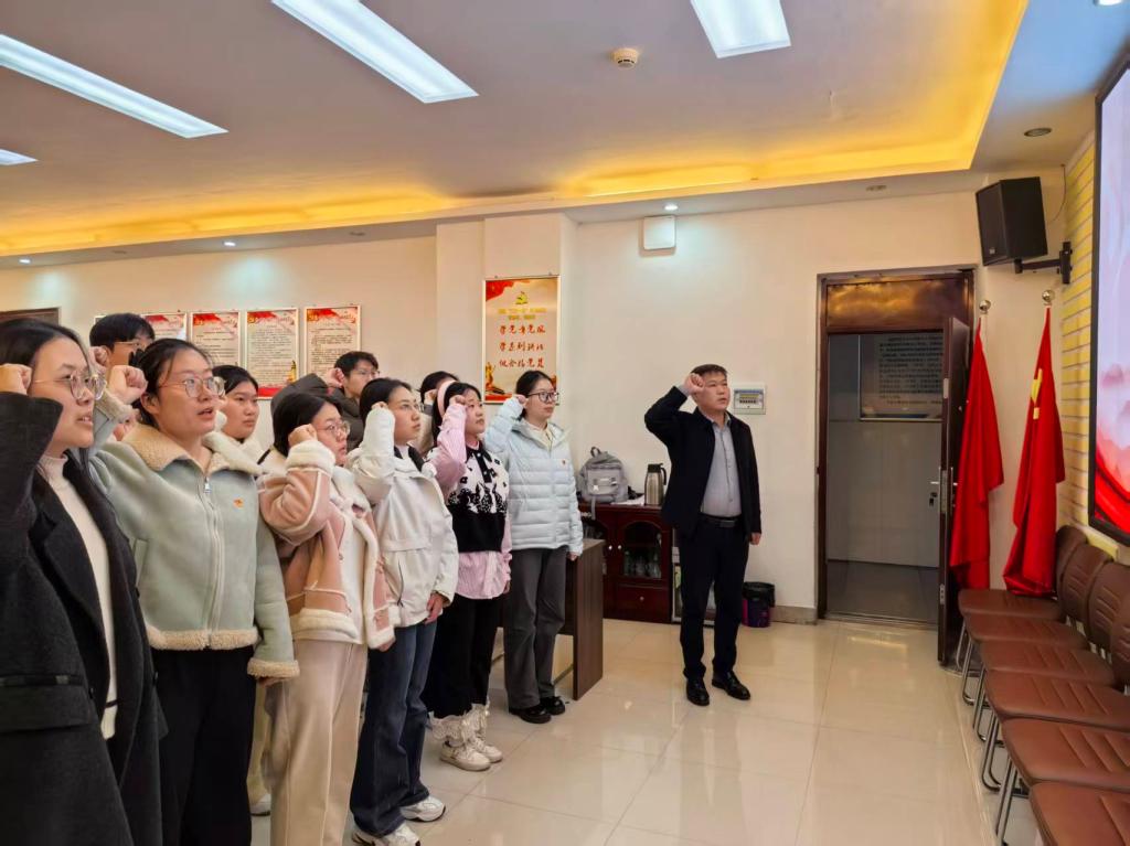 宣誓仪式在庄严的《国际歌》中拉开序幕。金天同志首先宣读新发展党员名单。随后,在王超同志的领誓下,全体预备党员面向党旗,举起右拳,庄严宣誓,表达了为共产主义事业奋斗终身的坚定决心。接着,预备党员代表唐子浩发言,他表示将筑牢思想根基,以实际行动践行入党誓言。正式党员代表余浩洋强调,党员身份是责任而非标签,呼吁大家勇担使命、锤炼作风。入党积极分子代表王志颖表示,将以新党员为榜样,加强理论学习、严守纪律,积极向党组织靠拢。