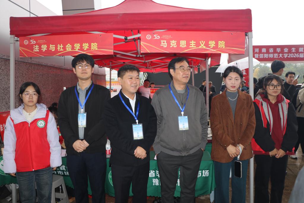 11月7日,河南省毕业生就业市场豫南分市场暨信阳师范大学2025届毕业生秋季双向选择洽谈会在体育馆举行。马克思主义学院党委副书记王超、副院长周智及就业秘书沈海蓄、杨春艳老师现场指导,为毕业生求职提供支持。