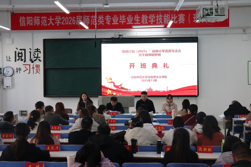 11月20日上午,信阳师范大学马克思主义学院在社科楼121教室举行“国培计划(2025)”县级小学道德与法治骨干教师研修班开班典礼。我院党委副书记王超、副院长常文涛出席典礼,班主任代表张琳、邱越及全体参训教师共同参会。本次开班典礼由常文涛主持。