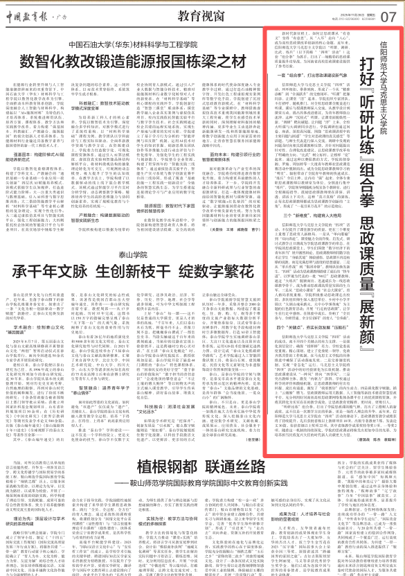 2025年11月28日,《中国教育报》第7版以《打好“听研比练”组合拳 思政课质量“展新颜”》为题,专题报道了我我院推进思政课建设的新理念、新举措、新成效。
