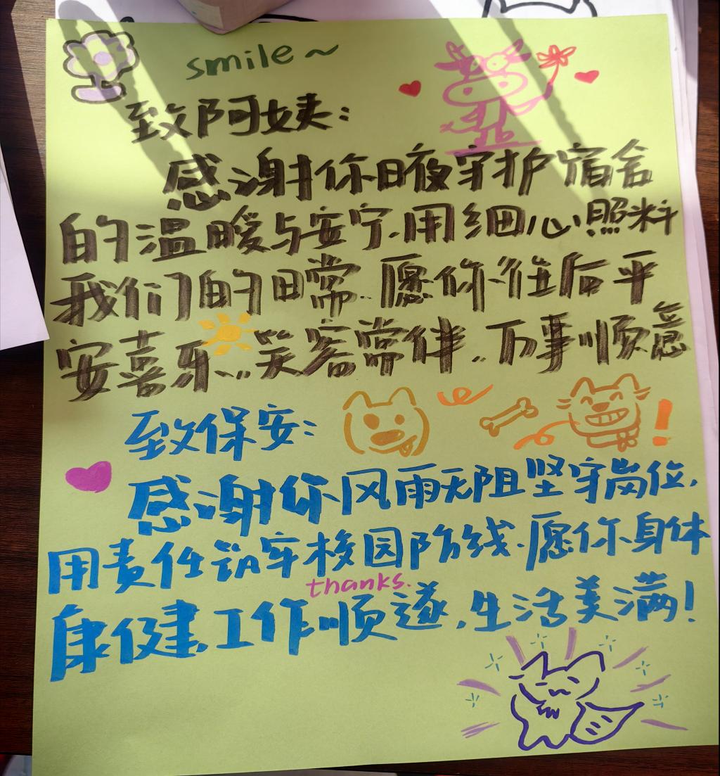 活动当天,阳光洒满校园一角,同学们围坐桌旁,兴致盎然地投入到创作中。废弃纸张成为“魔法画布”,彩笔绘出缤纷图案——可爱的卡通形象、温暖的祝福话语跃然纸上;旧纸袋则变身创意礼盒,折纸、粘贴、装饰,每一步都凝聚着巧思。大家分工协作,有的专注书写“致阿姨:感谢您用耐心照料我们的日常”“致保安:感谢您风雨无阻守护平安”等真挚话语,有的细心绘制太阳、花朵等装饰元素,现场洋溢着温馨与创意。