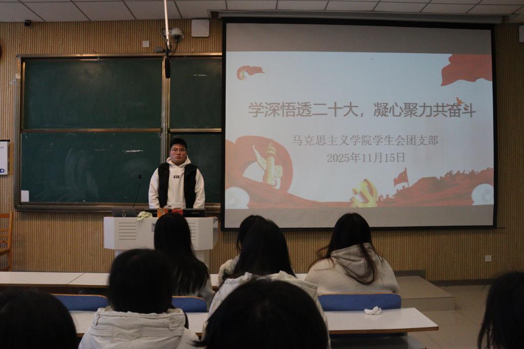 为深入学习贯彻党的二十大精神,引导广大青年学子坚定理想信念、勇担时代使命,马克思主义学院学生会于11月18日在社科楼514成功举办“学深悟透二十大,凝心聚力共奋斗”主题团课。本次活动由学院学生会主席团成员唐子浩主持,全体团支部成员积极参与。