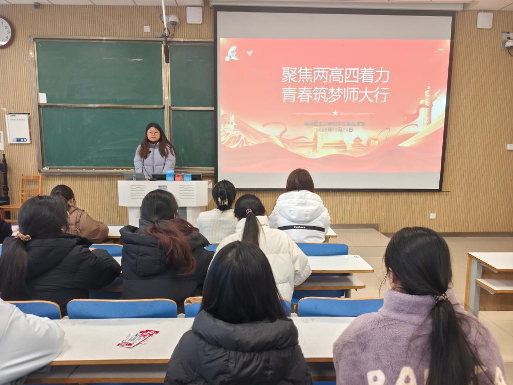 为引导青年学生深刻理解“两高四着力”内涵,12月16日上午,马克思主义学院于社科楼516教室开展“聚焦两高四着力 青春筑梦师大行”主题团课活动。本次团课由主席团成员张甜甜主持,我院学生会团支部全体成员参与本次活动。