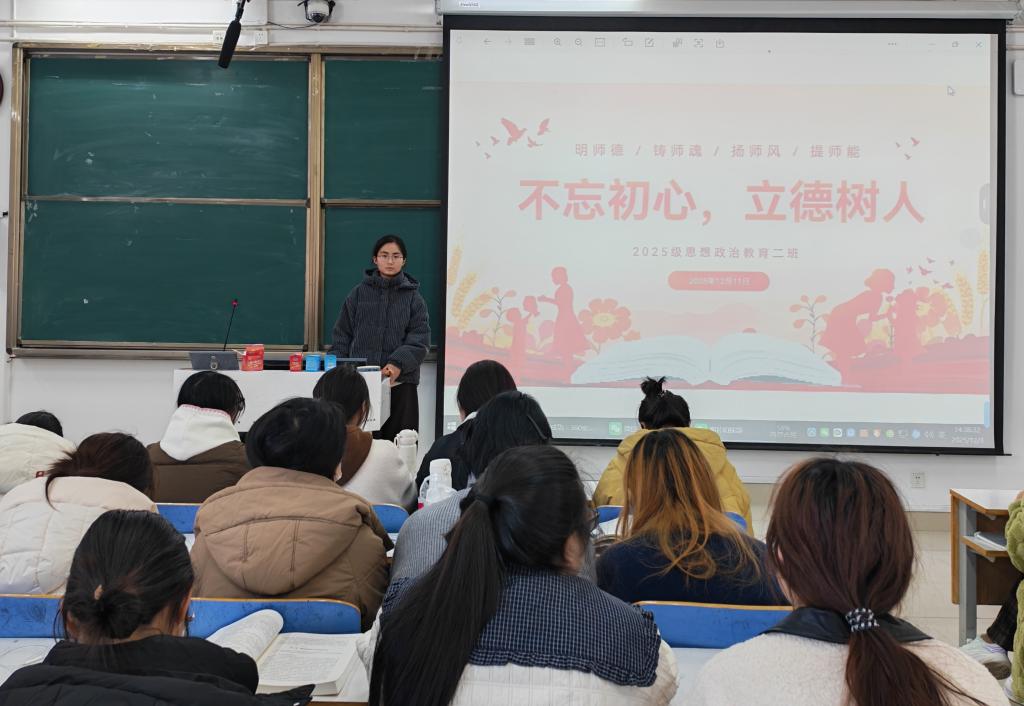 为深入学习贯彻党的二十大精神,强化未来思政课教师的师德修养与使命担当,12月11日上午,马克思主义学院2025级思想政治教育二班在社科楼514教室召开“明师德·铸师魂·扬师风·提师能”主题班会。班会由班长陈曦主持。