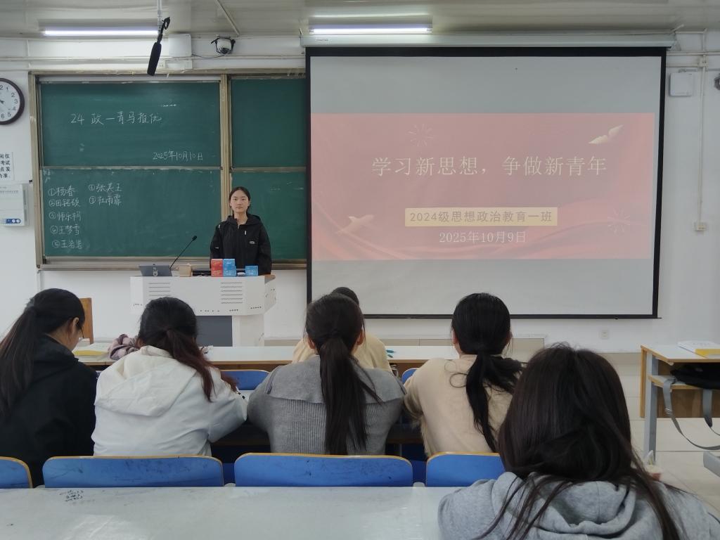 为激励我班同学深入学习和贯彻习近平新时代中国特色社会主义思想,将党的智慧结晶同个人发展实际相结合,以实际行动实现人生理想和民族复兴,10月9日上午,马克思主义学院思想政治教育一班于社科楼515教室开展“学习新思想,争做新青年”主题团课。本次团课由团支书李冉主持,一班全体同学参加。