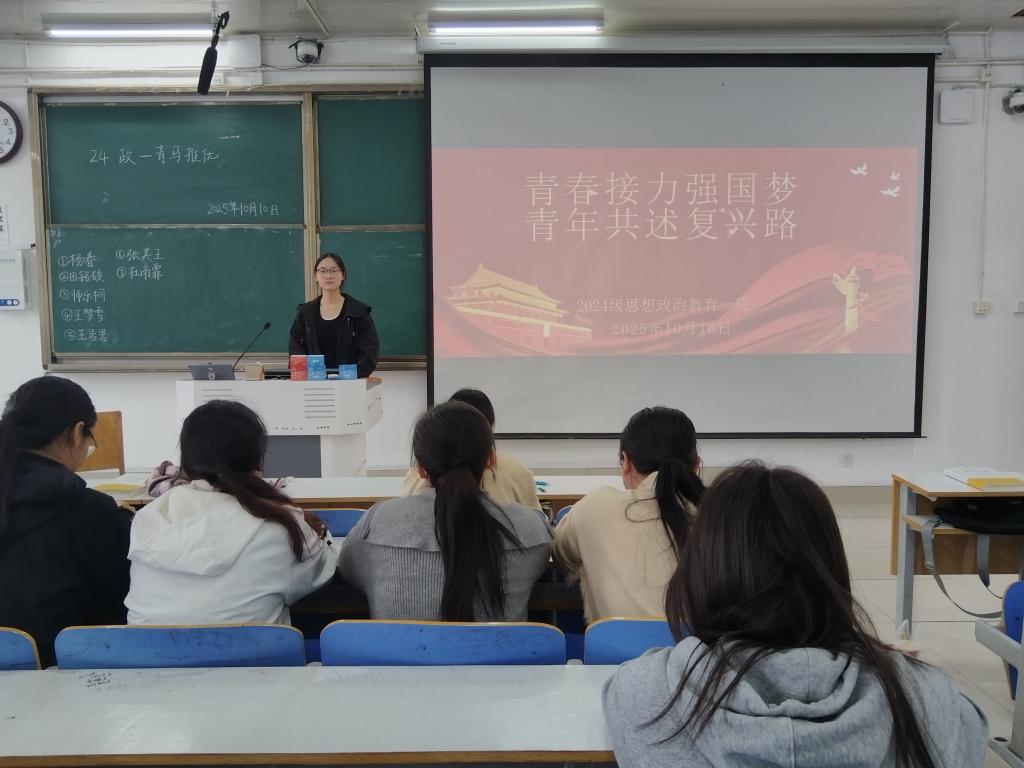 为帮助我班学生深入了解国家发展历程,清晰认识新时代强国梦、复兴路的核心内涵,并能将个人成长与国家发展、民族复兴相联系,树立责任和担当意识,10月16日上午,马克思主义学院2024级思政一班于社科楼514教室开展“青春接力强国梦,青年共述复兴路”主题团课。本次团课由团支书李冉主持,一班全体同学参加。