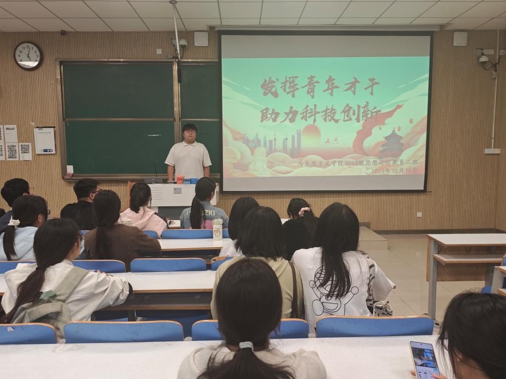 为激发青年学生创新精神,鼓励大家在科技强国建设中贡献青春力量,10月16日下午,马克思主义学院2024级思想政治教育二班在社科楼515教室举办了“发挥青年才干 助力科技创新”主题班会。本次班会由团支书王志颖主持,二班全体同学积极参与。