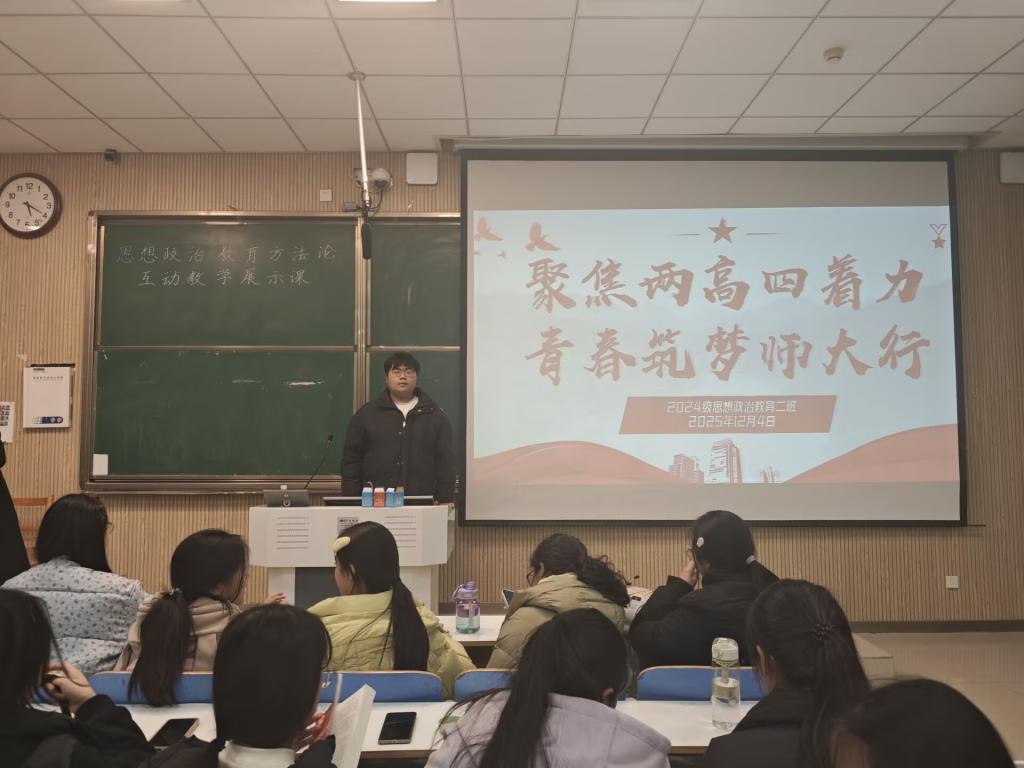 为引导青年学生深入理解学校发展目标与时代使命,增强责任意识与奋斗意识,12月4日下午,马克思主义学院2024级思想政治教育二班在社科楼515教室开展了“聚焦两高四着力 青春筑梦师大行”主题团课。本次团课会由团支书王志颖主持,二班全体同学共同参与。