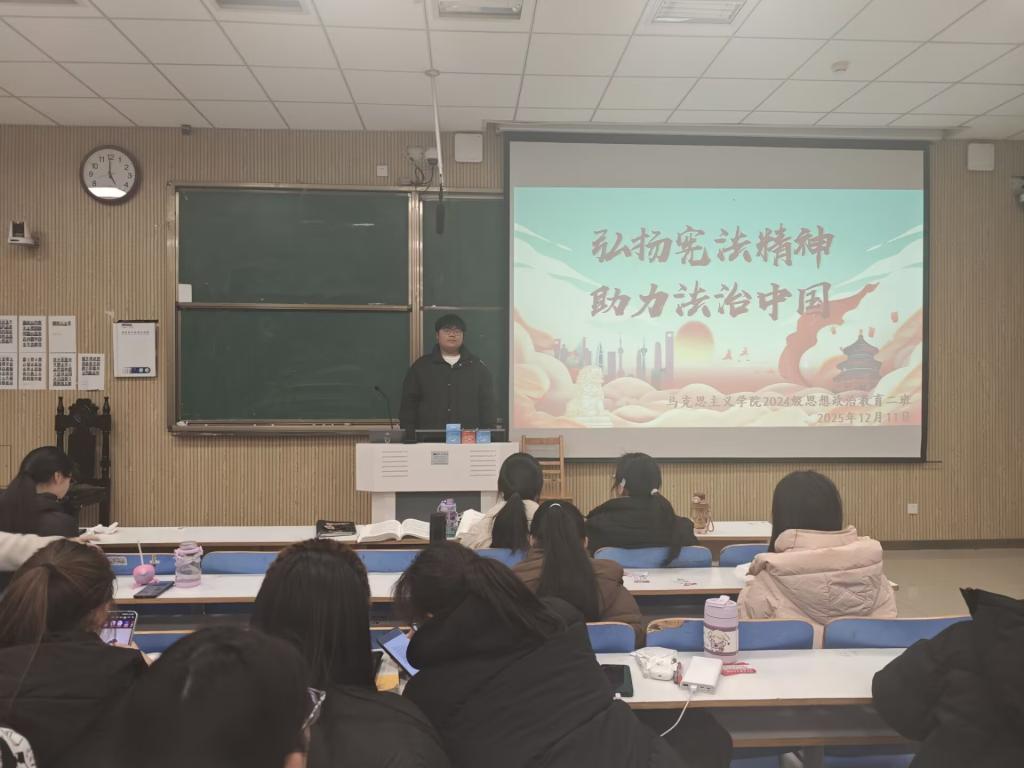 为增强青年学生的法治意识,树立宪法权威,推动新时代青年助力法治中国建设,12月11日下午,马克思主义学院2024级思想政治教育二班于社科楼515教室举办了“弘扬宪法精神,建设法治中国”主题团课活动。本次团课由团支书王志颖主持,二班全体同学共同参与。