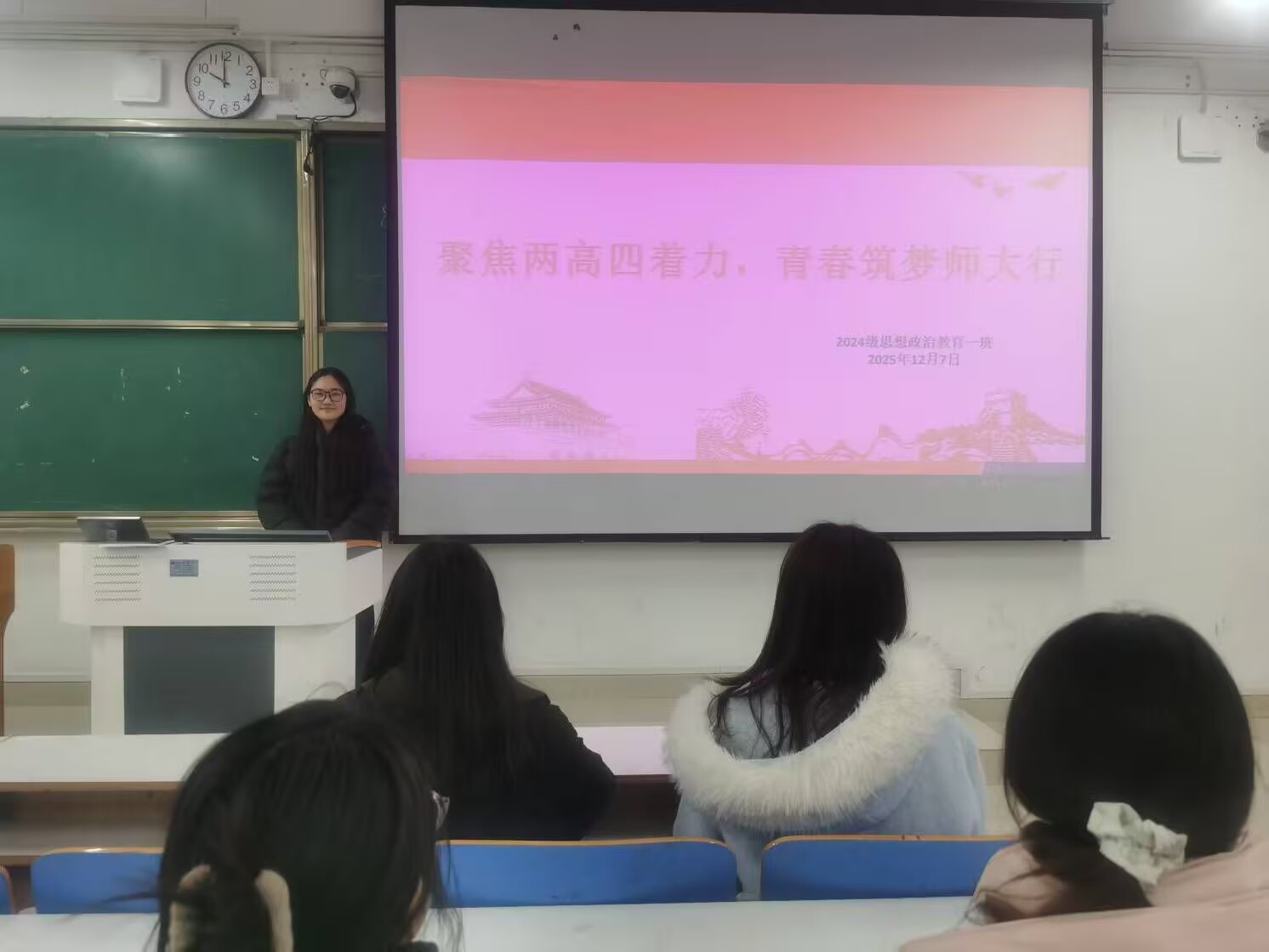 为深入领会“四高四着力”发展要求,凝聚我班学子奋进力量,12月7日上午,马克思主义学院2024级思政一班于社科楼514教室开展“聚焦四高四着力,青春筑梦师大行”主题团课。本次团课由团支书李冉主持,一班全体同学参加。