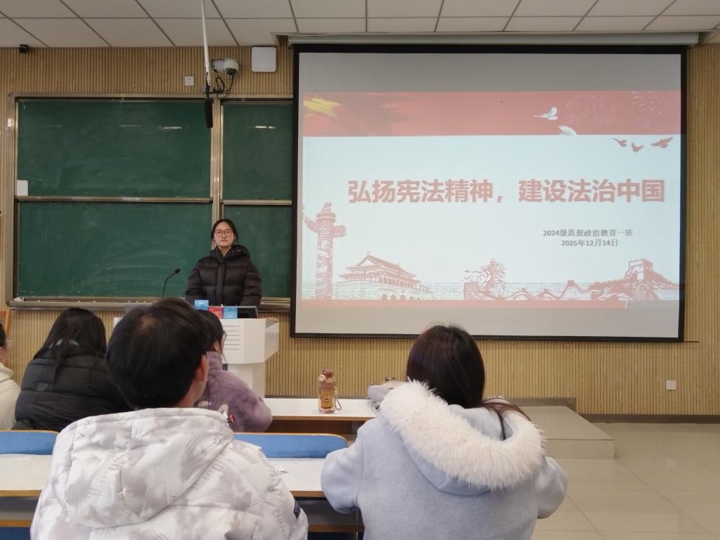 为增强我班学生的宪法意识和法治素养,筑牢法治信仰根基,12月14日上午,马克思主义学院2024级思政一班于社科楼514教室开展“弘扬宪法精神,建设法治中国”主题团课。本次团课由一班团支书李冉主持,一班全体同学参加。
