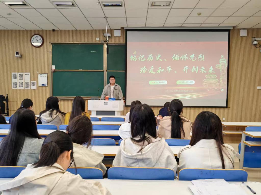 为引导青年学生传承红色基因,厚植爱国情怀,马克思主义学院2024级思想政治教育三班于10月17日在社科楼515开展“铭记历史,缅怀先烈”主题团课活动。本次班会由班级团支书杨迎滨主持,全体同学共同参与。