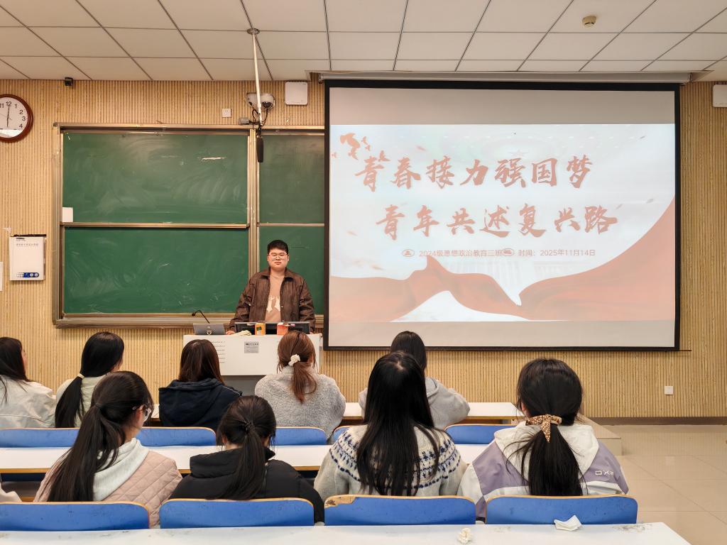 为深入学习贯彻习近平新时代中国特色社会主义思想,引导青年学子将个人理想融入国家发展大局,马克思主义学院2024级思想政治教育三班于11月14日在社科楼515教室召开“青春接力强国梦,青春共述强国路”主题团课活动。此次活动由团支书杨迎滨主持。
