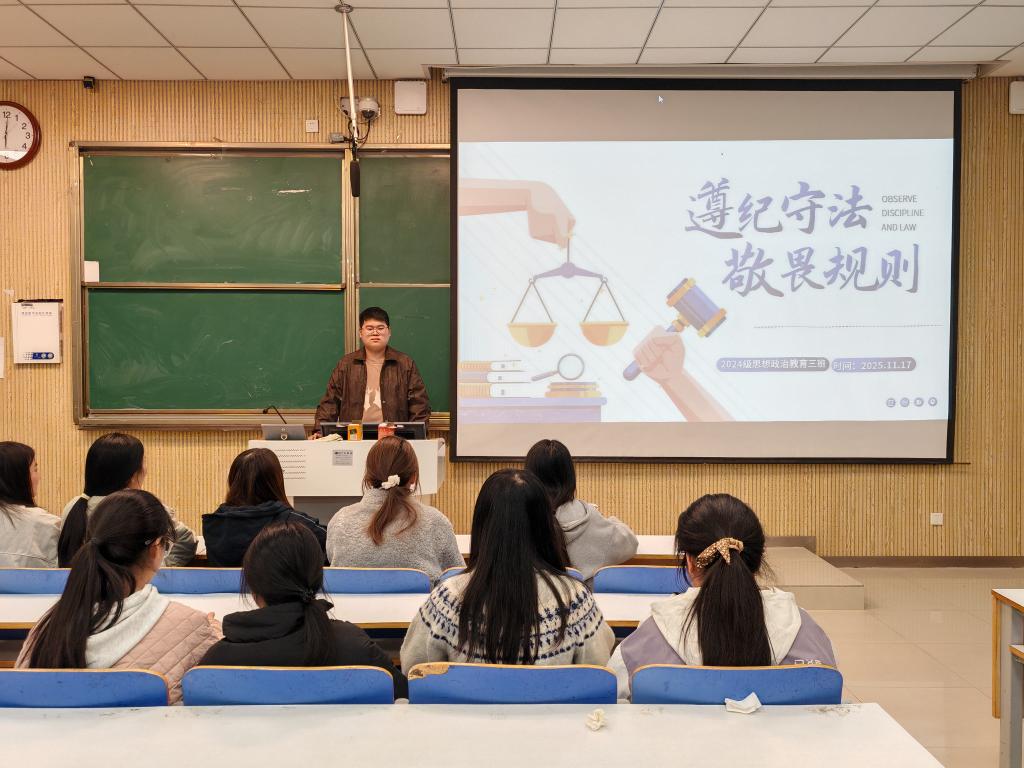 为增强同学们的法治观念与规则意识,引导青年学子树立正确的权利义务观,马克思主义学院2024级思想政治教育三班于11月17日在社科楼515教室成功举办“遵纪守法,敬畏规则”主题班会活动。本次活动由班长主持,全体同学积极参与。