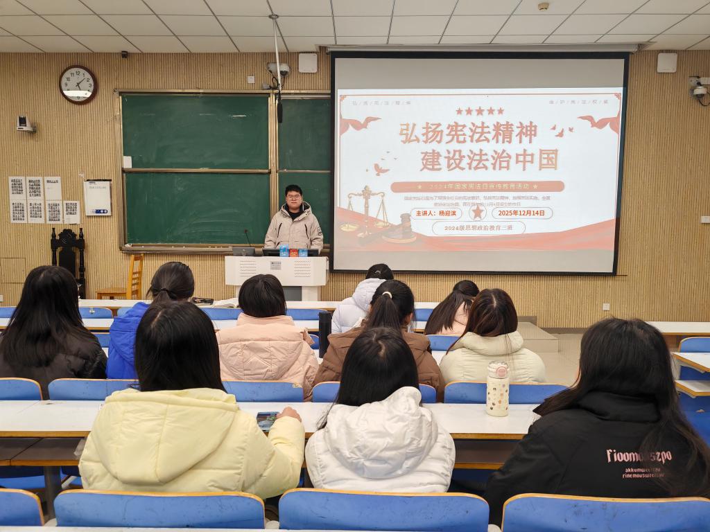 为深入学习贯彻习近平法治思想,引导青年学子增强宪法意识、树立法治观念,马克思主义学院2024级思想政治教育三班于12月14日在社科楼515教室组织开展“弘扬宪法精神,建设法治中国”主题团课。班级成员齐聚一堂,共同学习宪法知识、感悟法治力量。