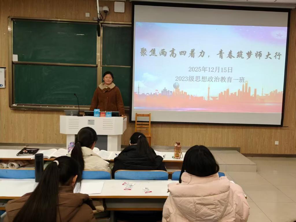 为深入贯彻“两高四着力”相关要求,引导班级学子将青春理想融入时代发展大局,强化师范生的使命担当,12月15日下午,马克思主义学院2023级思想政治教育一班于社科楼515教室召开“聚焦两高四着力,青春筑梦师大行”主题团课。全班同学悉数参与,团课由团支书张卓主持。