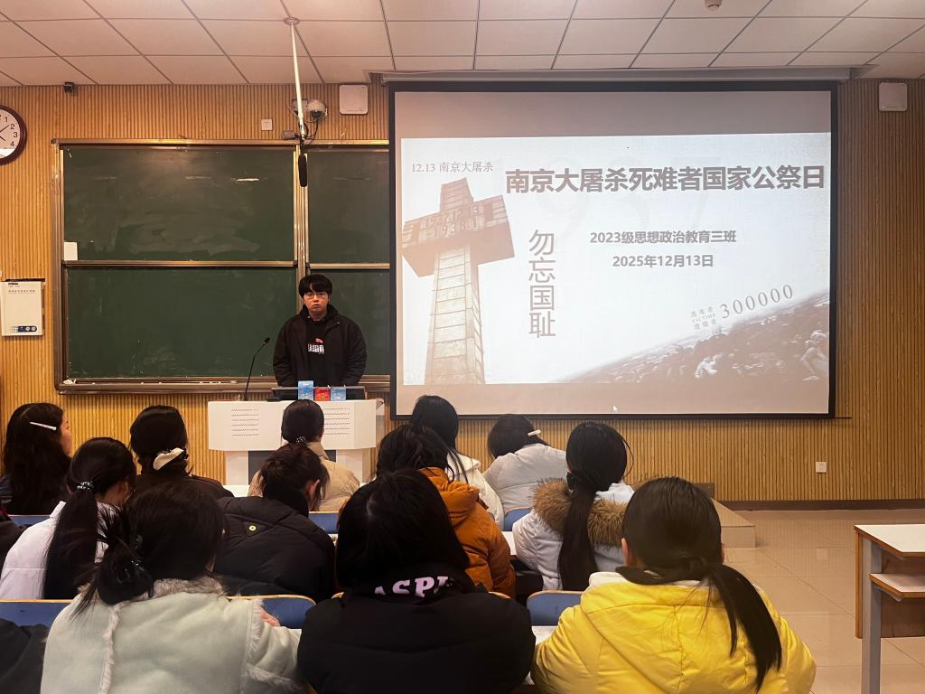 为缅怀先烈,引导青年不忘历史,12月13日下午,马克思主义学院2023级思想政治教育三班在社科楼515教室召开“南京大屠杀死难者国家公祭日”主题班会。我院2023级思想政治教育三班全体成员共同参加此次团课,班会由团支书郝瀚主持。