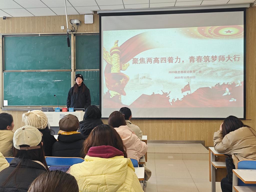 “时代总是把历史责任赋予青年”,为引导青年大学生听清时代脉搏,抓牢历史责任,12月12日下午,马克思主义学院2023级思想政治教育二班在社科楼515教室召开“聚焦两高四着力,青春筑梦师大行”主题团课。本次团课由团支书王慜初主持,全体二班同学参加。